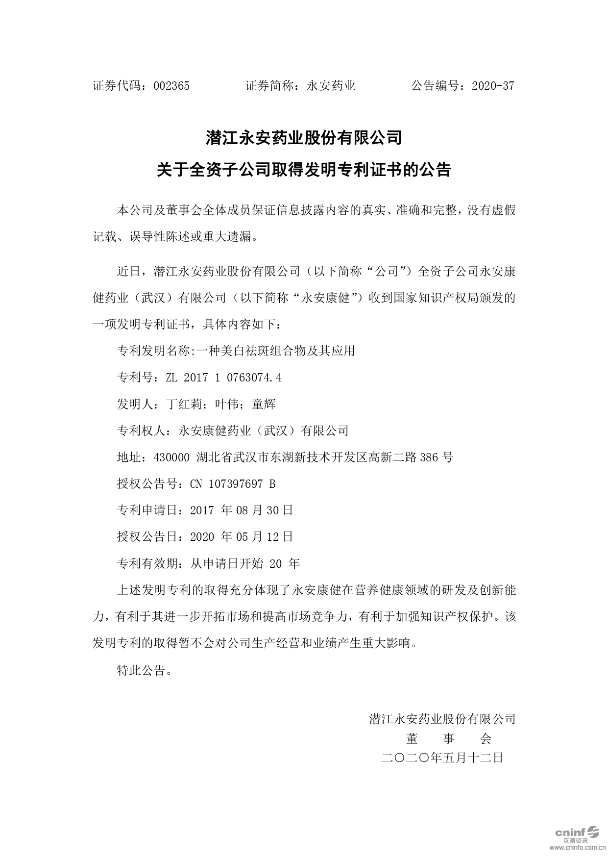 關(guān)于全資子公司取得發(fā)明專利證書的公告